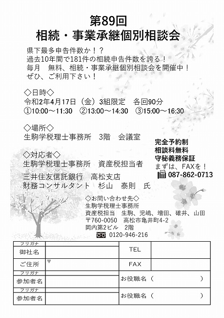 令和2年4月17日(金)『第89回相続・事業承継個別相談会のご案内』
