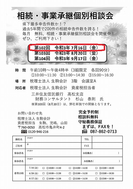 令和3年7月16日(金)『第102回相続・事業承継個別相談会のご案内』