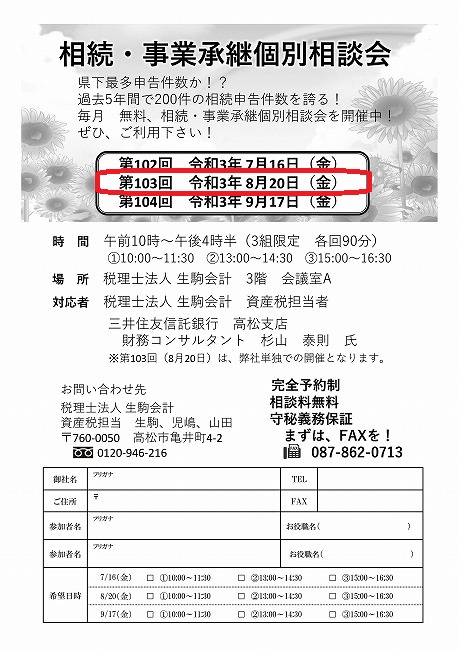 令和3年8月20日(金)『第103回相続・事業承継個別相談会のご案内』