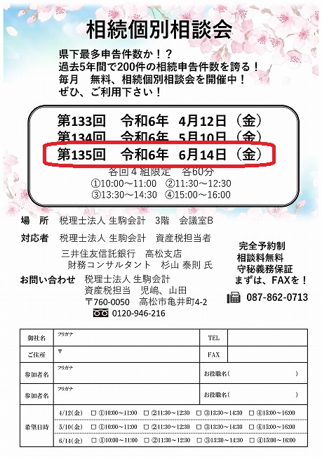 令和6年6月14日(金)『第135回相続個別相談会のご案内』