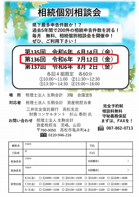 令和6年7月12日(金)『第136回相続個別相談会のご案内』