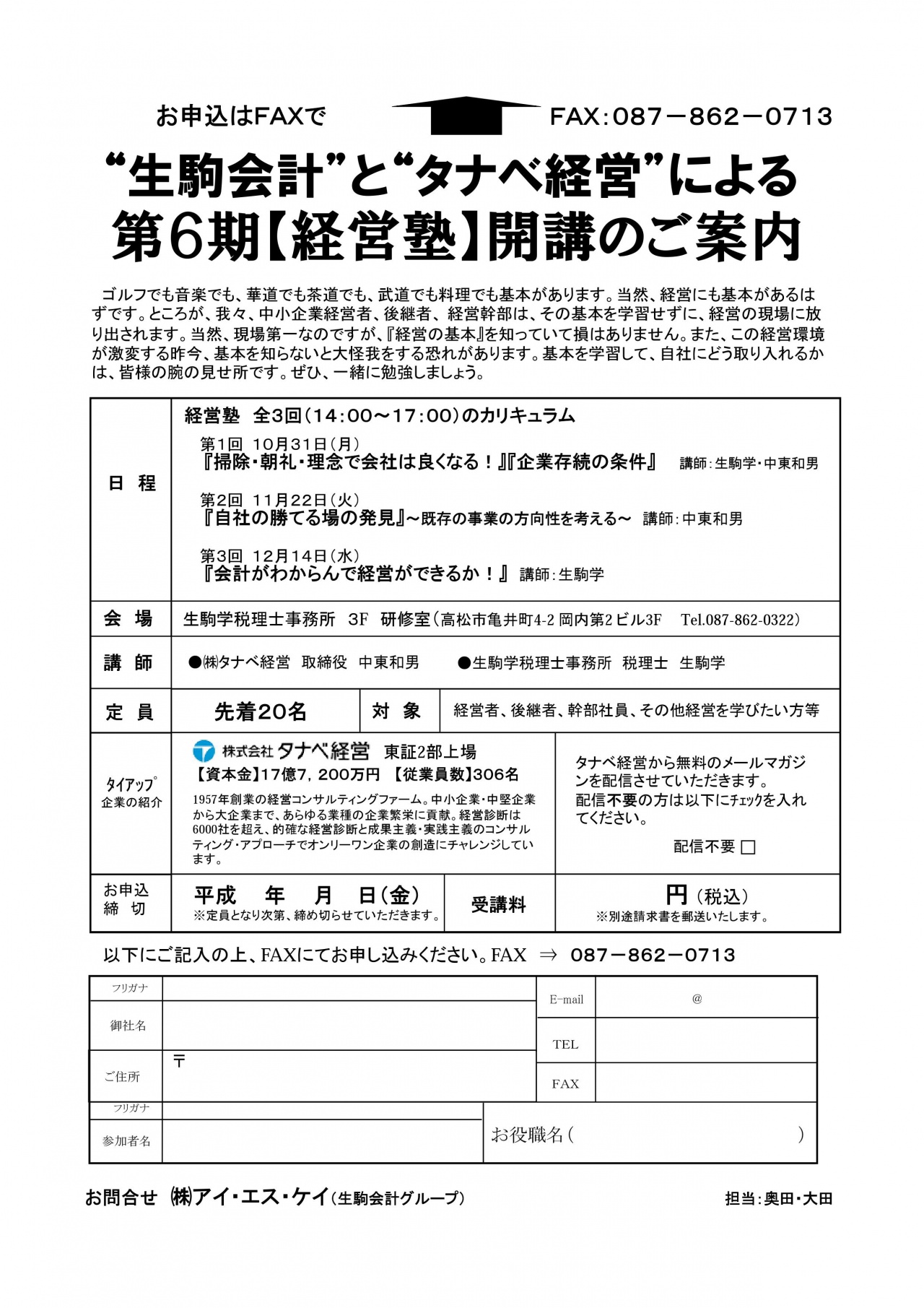 | 会場 | 生駒学税理士事務所3F 研修室 (高松市亀井町4-2 岡内第2 ビル3F Tel.087-862-0322) |
