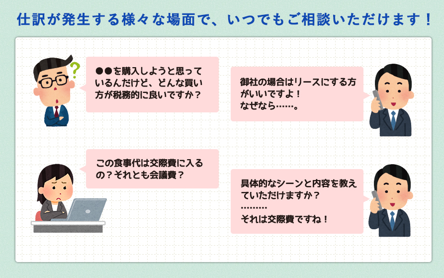 ※売上高、従業員数、仕訳数、経理状況、支店・部門の有無 輸入、輸出の有無、会社形態(株式会社、医療法人、社会福祉法人など)、訪問型・来所型、中間申告、年調の有無等によって価格は変動します。